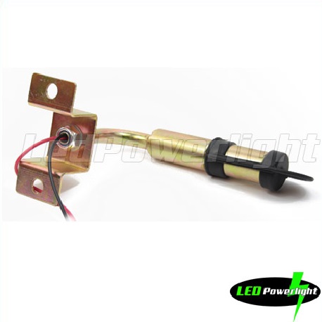 Support de gyrophare coudé avec patte de fixation, permettant de se viser grâce aux deux trous sur les extrémités, ainsi qu'une prise incorporée et son capuchon de protection.